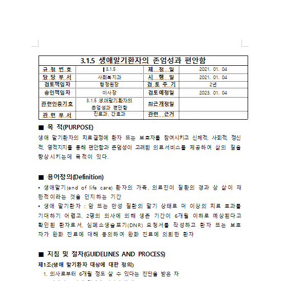 생애 말기 환자의 치료 결정에 환자 또는 보호자를 참여시키고 신체적, 사회적, 정신적, 영적지지를 통해 편안함과 존엄성이 고려된 의료서비스를 제공하여 삶의 질을 향상하는데 목적을 두는 규정(한글파일)입니다.