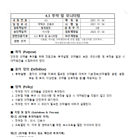 안전한 의약품 투여를 위해 직원교육, 투약설명, 의약품의 보관, 주의 사항 및 부작용 발생 시 대처 방안을 수립하기 위한 규정(한글파일)입니다.