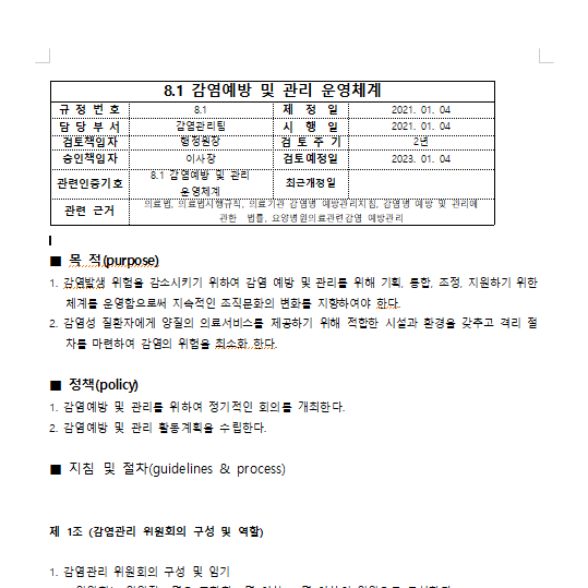 감염발생 위험을 감소시키기 위하여 감염 예방 및 관리를 위해 기획, 통합, 조정, 지원하기 위한 체계를 운영함으로써 지속적인 조직문화의 변화를 지향하고, 감염성 질 환자에게 양질의 의료서비스를 제공하기 위해 적합한 시설과 환경을 갖추고 격리 절 차를 마련하여 감염의 위험을 최소화 하기위한 규정(한글파일)입니다.
