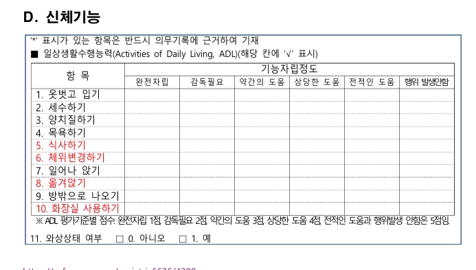 환자평가표 K. 특수처치 및 전문재횔치료/ 부록. ADL 평가 구체적사항