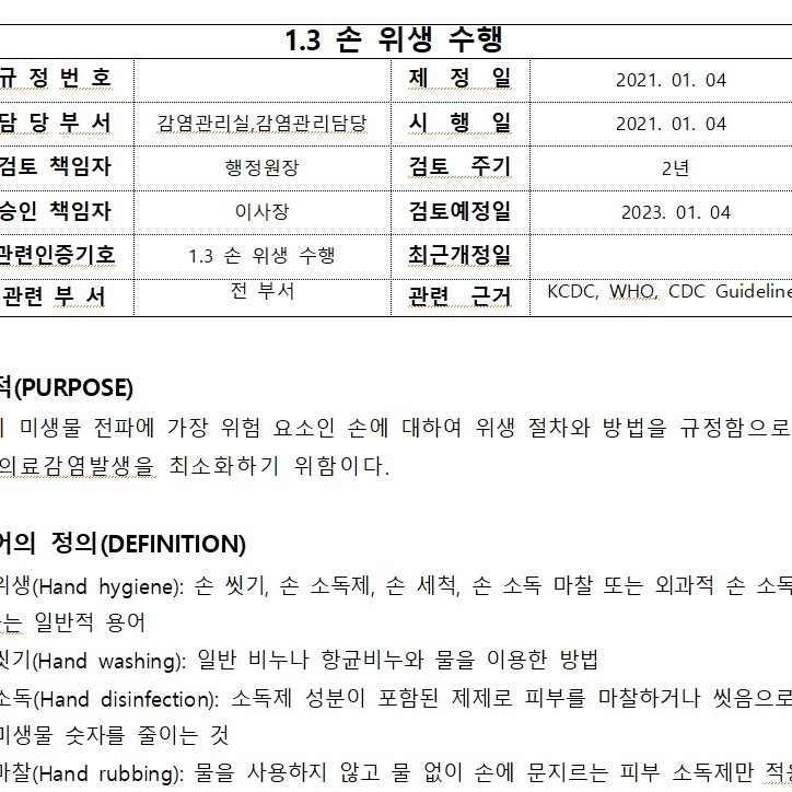 병원의 미생물 전파에 가장 위험 요소인 손에 대하여 위생 절차와 방법을 규정함으로써 병원의 의료감염발생을 최소화하기 위함 손위생관리규정이다
