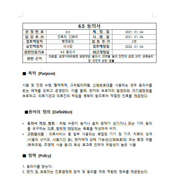 시술 및 진정 수행, 혈액제제, 고위험의약품, 신체보호대를 사용하는 경우 동의서를 받는 체계를 갖추고 운영한다. 이를 통해, 환자와 보호자의 알권리와 자기결정권을 보호하고, 의료기관과 의료진의 책임을 명확히 함으로써 적절한 진료를 제공하기 위한 규정(한글파일)입니다.